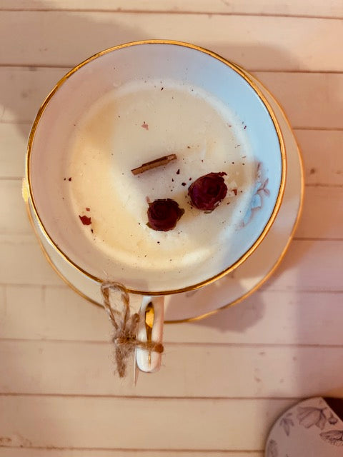 Ogni candela nasce in una tazza da tè d’epoca, scelta con cura.