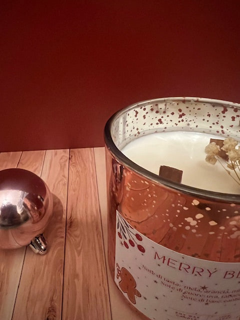 Candela in cera di soia da 500 gr in vaso traforato colo oro rosa.